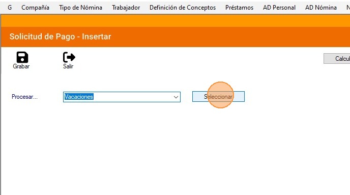 17. En la lista "Procesar", selecciona "Vacaciones" y presiona "Seleccionar".