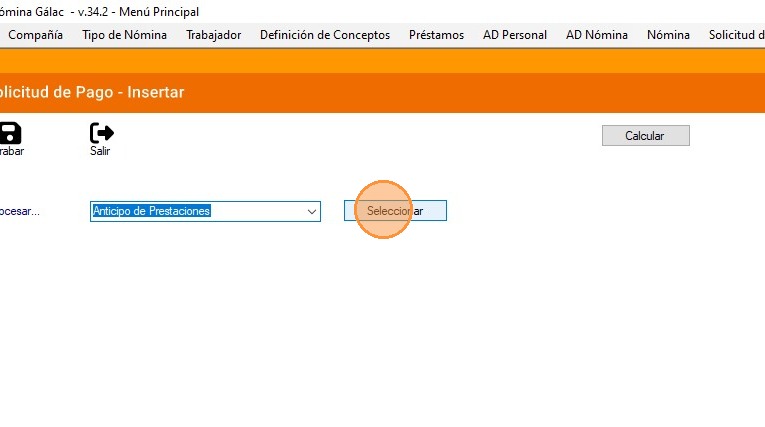 32. En la lista Procesar selecciona "Anticipo de Prestaciones " y presiona "Seleccionar"