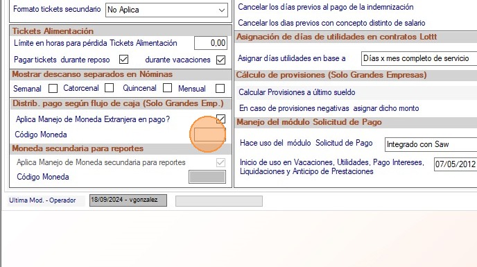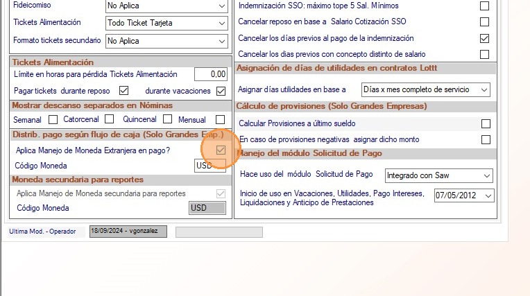 3. Activa la opción "Aplica Manejo de Moneda Extranjera en pago?" al activar esta opción se habilitará el módulo de "Solicitud de Pago".