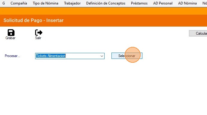 43. En la lista Procesar selecciona "Tickets Alimentación" y presiona "Seleccionar"