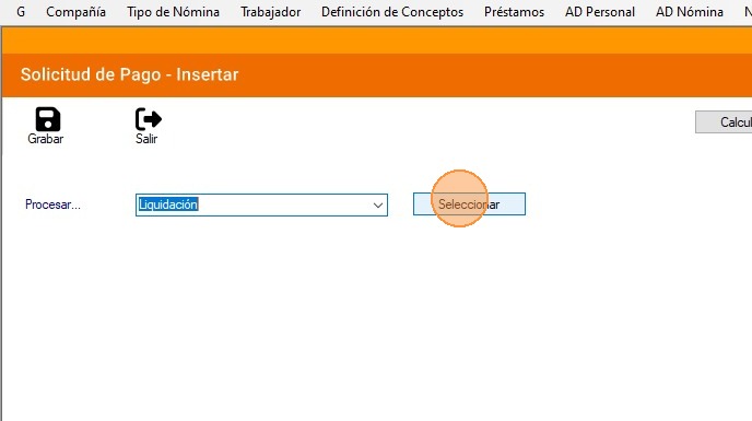 28. En la lista "Procesar" selecciona "Liquidación" y presiona "Seleccionar".