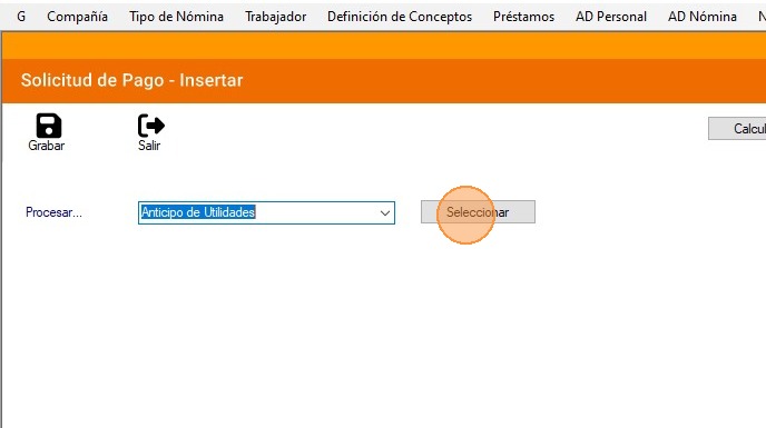 36. En la lista Procesar selecciona "Anticipo de Utilidades" y presiona "Seleccionar"