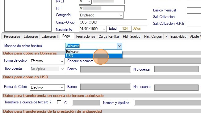 Nº cuenta: ingrese el número de cuenta del trabajador para realizar el pago en moneda extranjera, según la elegida al activar el