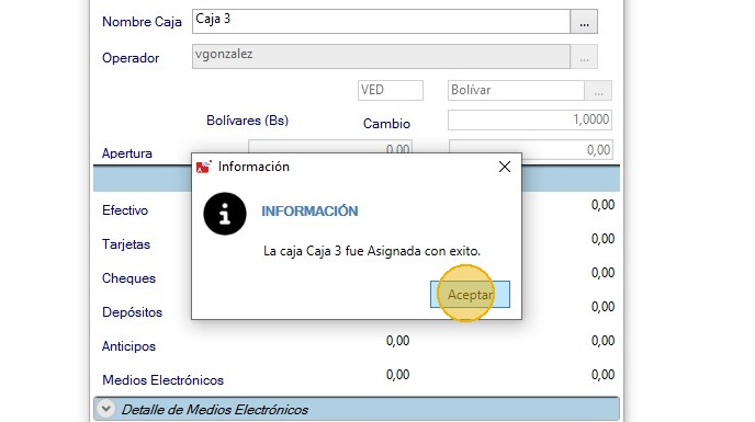 7. Se mostrará un mensaje indicando que la caja fue asignada con éxito al usuario.