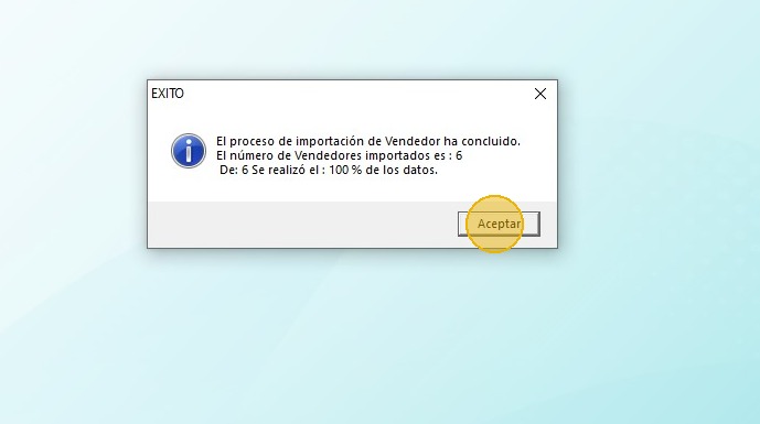 8. Comenzará el proceso de importación de vendedores, al finalizar el proceso se mostrará el siguiente mensaje con el resumen de la importación, haz clic en "Aceptar" para finalizar.