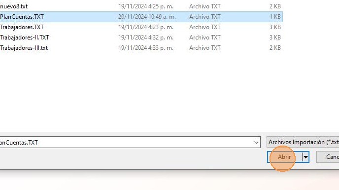 10. Selecciona el archivo "PlanCuentas.txt", luego haz clic en "Abrir".