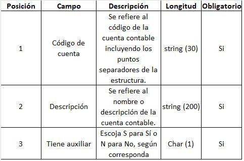 2. Así debe ser la estructura del archivo de importación de "Cuentas contables".
