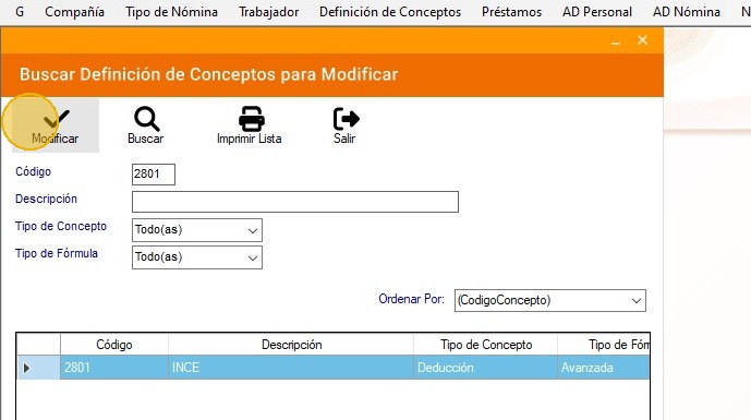 16. Seguidamente, busca el concepto "2801" - "INCE" y presiona en "Modificar".