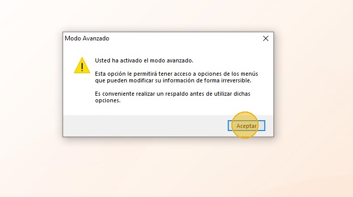 8. Importante: Antes de utilizar esta opción, se recomienda hacer un respaldo de su base de datos y contactar al Centro de Soporte de Gálac para recibir la asesoría adecuada. Lee el mensaje y haz clic en "Aceptar".