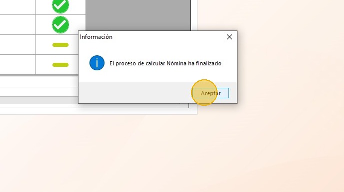 44. Al terminar el proceso de calcular la nómina, el sistema mostrará el siguiente mensaje; léelo y haz clic en "Aceptar".