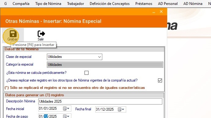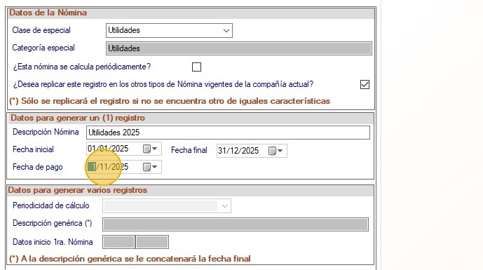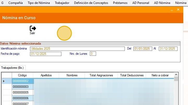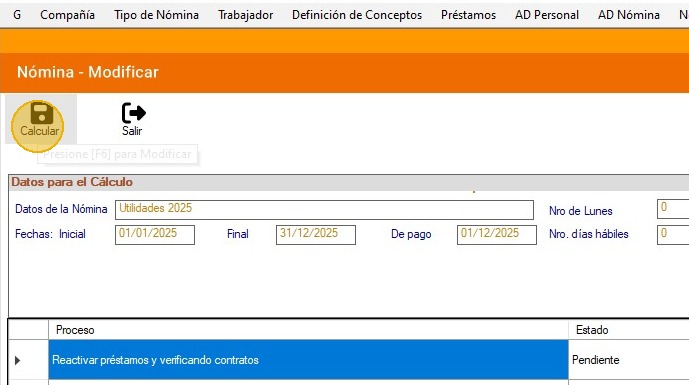 1. Asegúrate de estar en la compañía y en el tipo de nómina al cual le aplica el cálculo de utilidades.