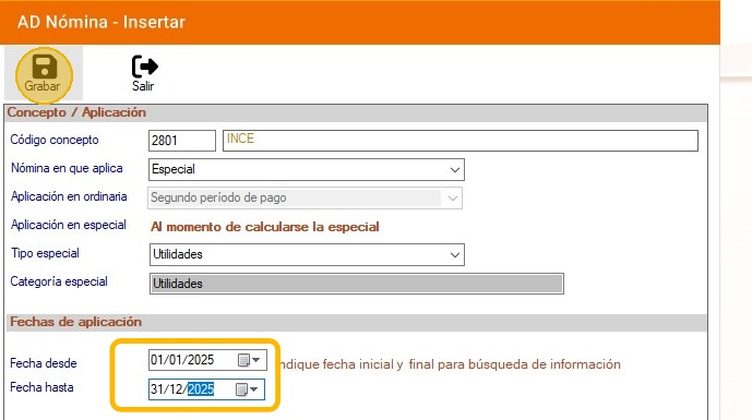 20. Luego coloca la fecha "Desde" y"Hasta" y presiona en "Grabar".