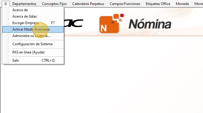 7. Primero que nada, debes activar el modo avanzado en el nómina, para ello, haz clic en "G - Activar Modo Avanzado".