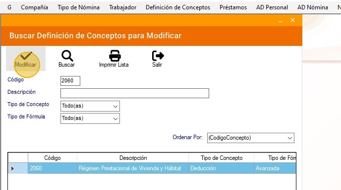 12. Seguidamente, ubica el concepto "2060" - "Régimen Prestaciones de Vivienda y Hábitat" y presiona en "Modificar".