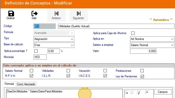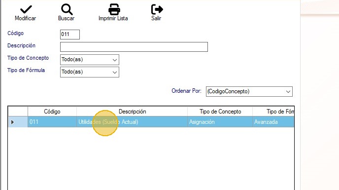 10. Ubica el concepto "011 - Utilidades (Sueldo Actual)" y haz clic en "Modificar".