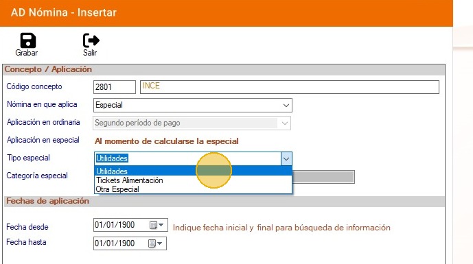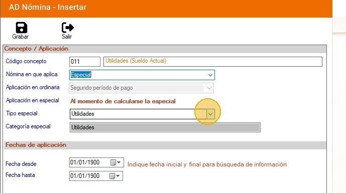 19. Inserta el concepto 011 de utilidades, el cual debe aplicar en: