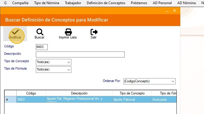 14. A continuación, busca el concepto "9903" - "Aporte Pat. Régimen Prestacional Viv y Hábitat" y presiona en "Modificar".