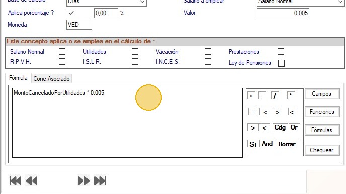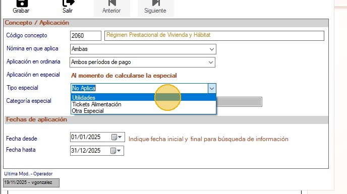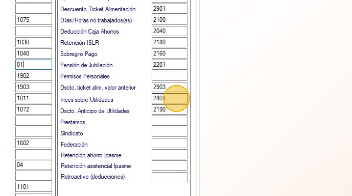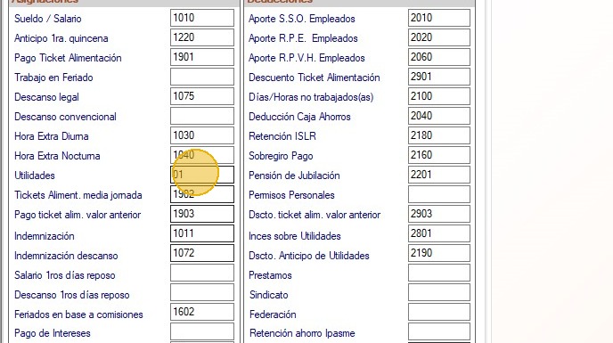 5. Consulta que están asignados los conceptos de utilidades y de INCES en el módulo, para efectos de este instructivo usaremos el código 01 para utilidades