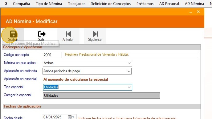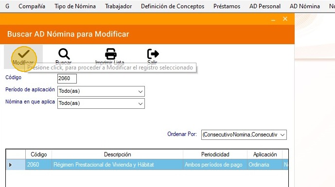 25. Ahora ubica el concepto "2060 - Régimen Prestaciones de vivienda y Hábitat" y haz clic en "Modificar".