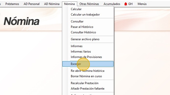 39. Para caluclar la nómina, haz clic en "Nómina - Escoger".