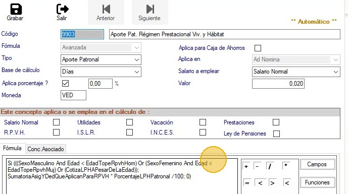 13. Verifica que el concepto "2060" "Régimen Prestaciones de Vivienda y Hábitat" aplica sobre salario normal.