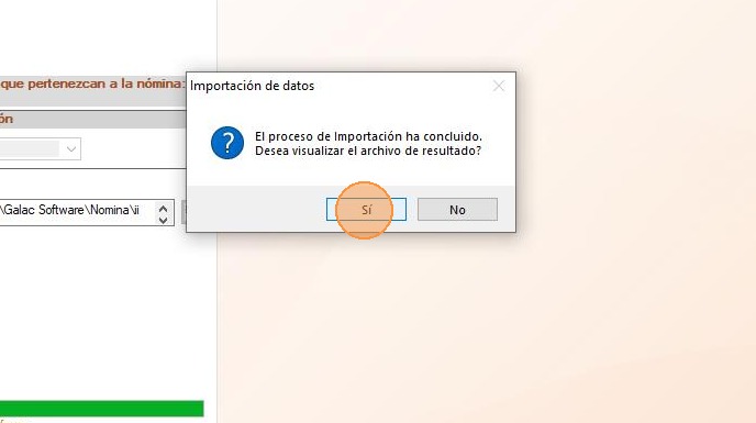 10. Al terminar el proceso de importación, el sistema mostrará el siguiente mensaje léelo y haz clic en "Sí" para ver el resultado de la importación.