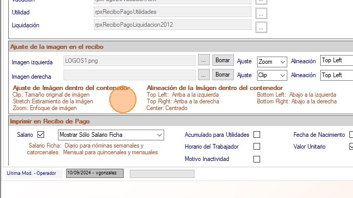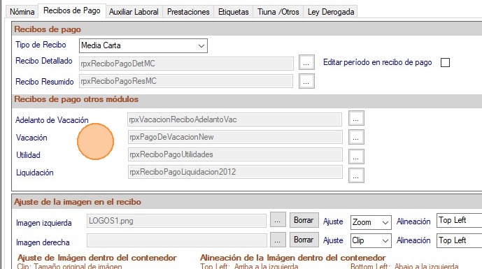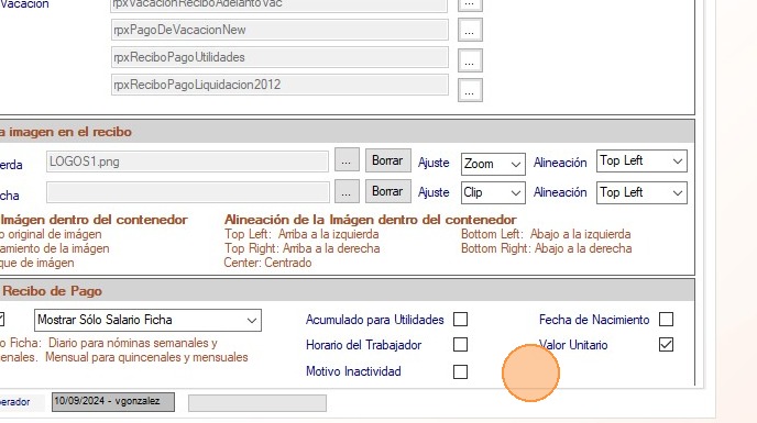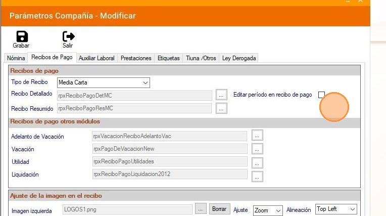 Permite agregar la imagen del logo de la compañía en la parte superior del recibo, en los Recibos de pago de la nómina, vacaciones, utilidades y liquidación. Ajuste: Selecciona la opción de su preferencia: