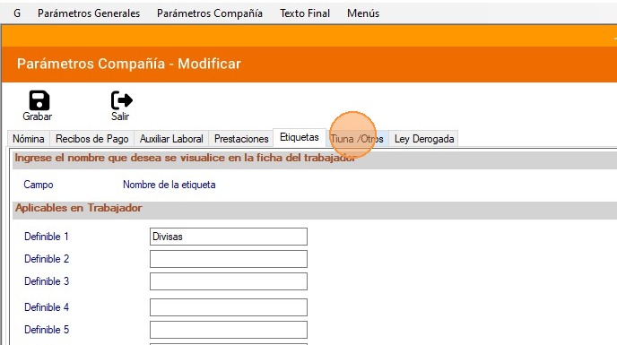 Tip: En esta pestaña se asigna el nombre a los campos definibles ubicados en la pestaña Laborales de la Ficha del trabajador.