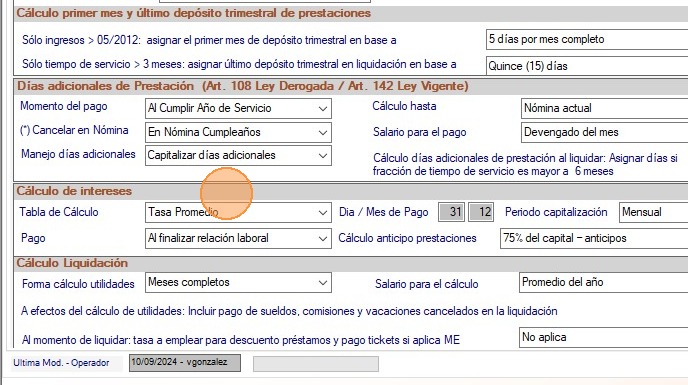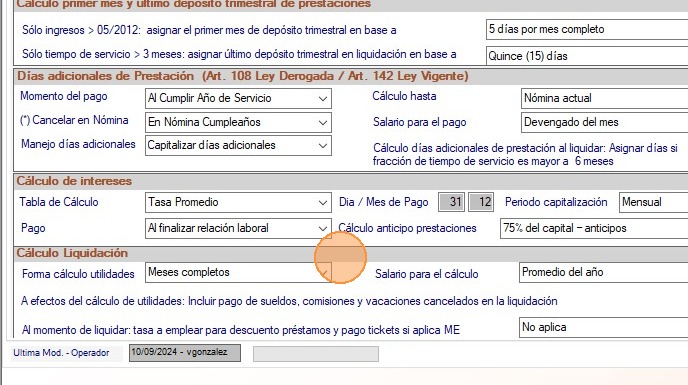 Forma de cálculo: Determina la forma de calcular las utilidades en liquidación. Los valores disponibles son: Meses completos y Porcentaje (D. Utilidades/360/100).