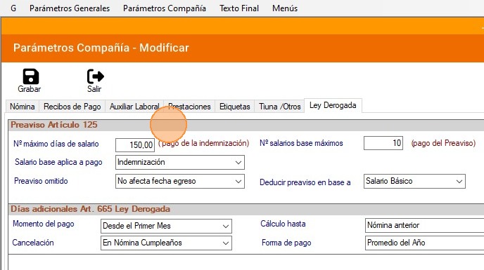 Cancelar en Nómina (Este parámetro sólo aplica para ley derogada): Permite indicar si los días adicionales de prestación se asignarán en la nómina en la que el trabajador cumpla el año de servicio o en la nómina inmediata anterior. Los valores disponibles son: En nómina Cumpleaños o en nómina anterior.
