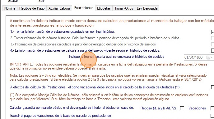 Indique la fecha hasta la cual se empleará el histórico de sueldos: Permite indicar al sistema la fecha hasta la cual empleará el histórico de sueldos del trabajador para el cálculo de prestaciones sociales. De la fecha indicada en adelante, la información de las prestaciones se tomará de la calculada en las nóminas históricas.