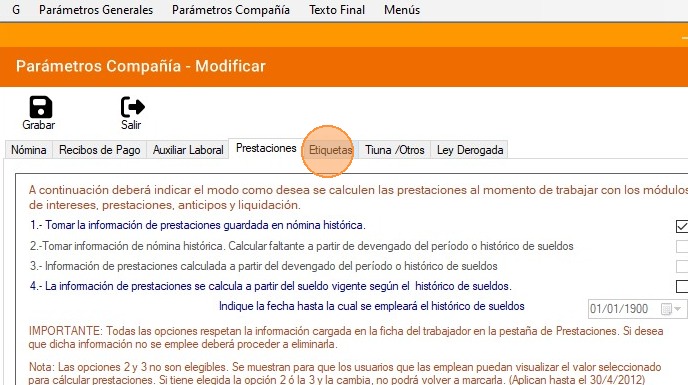 La información de prestaciones se calcula a partir del sueldo vigente según el histórico de sueldos: Esta última opción permite calcular la información de prestaciones empleando únicamente el histórico de sueldos.