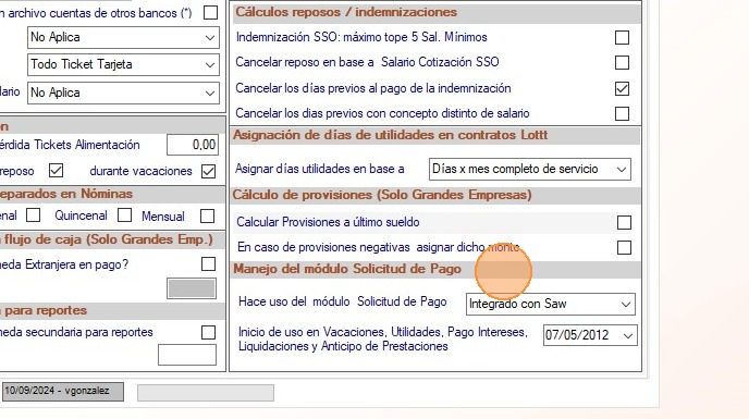 Sección manejo del módulo Solicitud de Pago