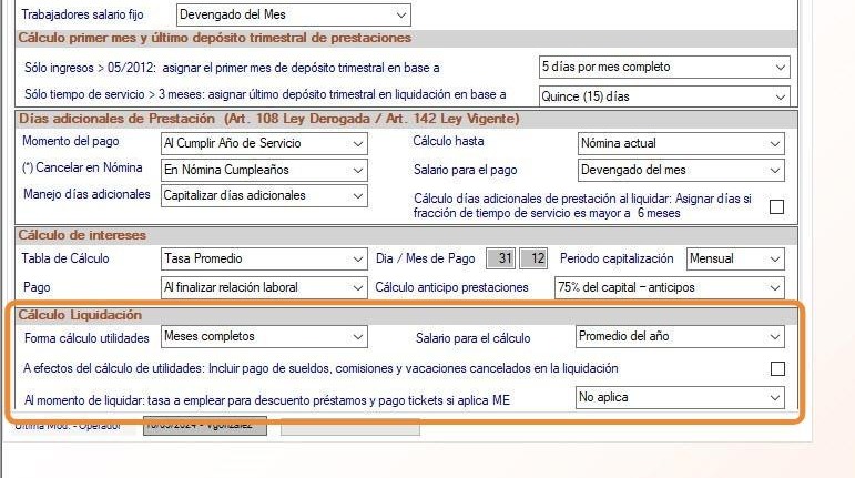 Cálculo anticipo prestaciones: Permite indicar cuál será la base de cálculo para otorgar anticipos sobre prestaciones sociales. Los valores disponibles son: