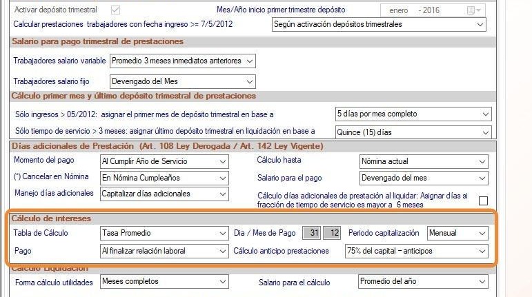 Período capitalización: Permite establecer si los intereses se capitalizaran en las prestaciones mensual o anualmente.