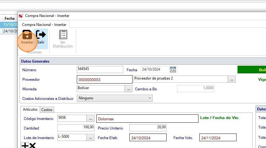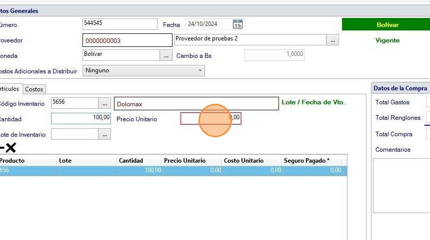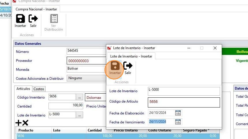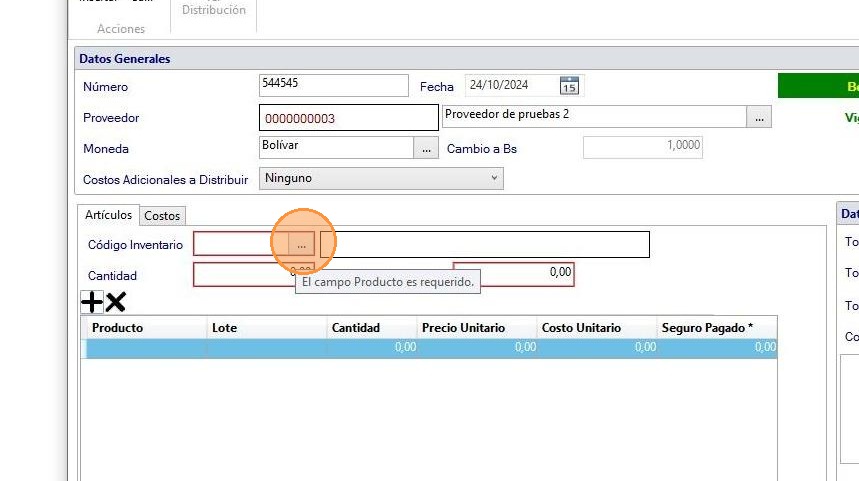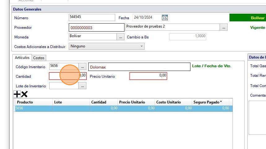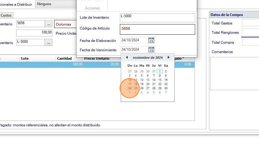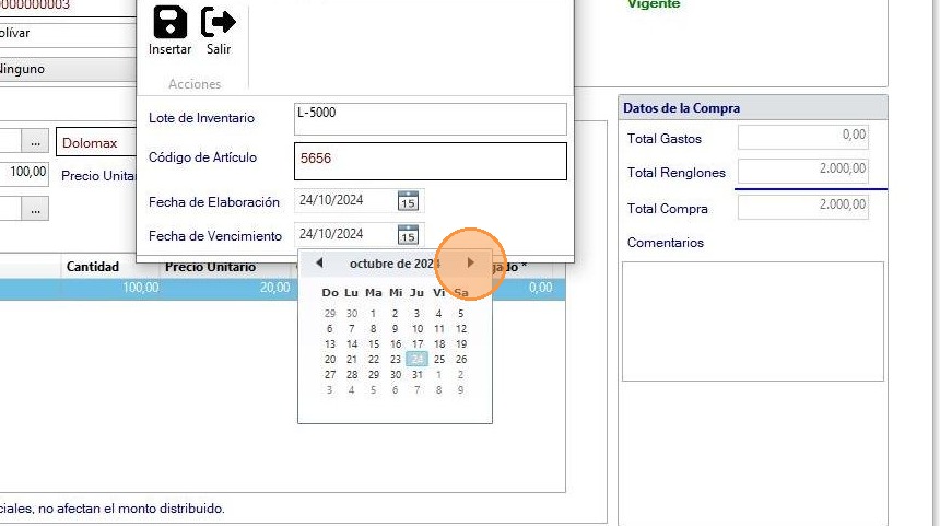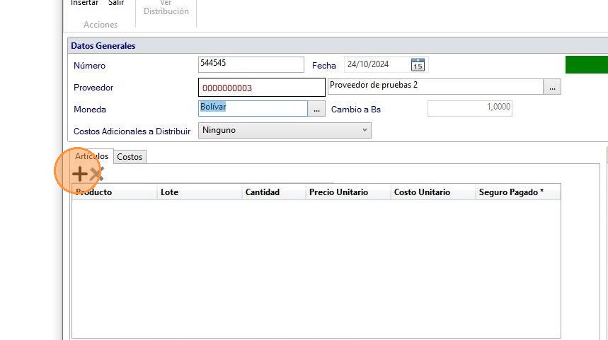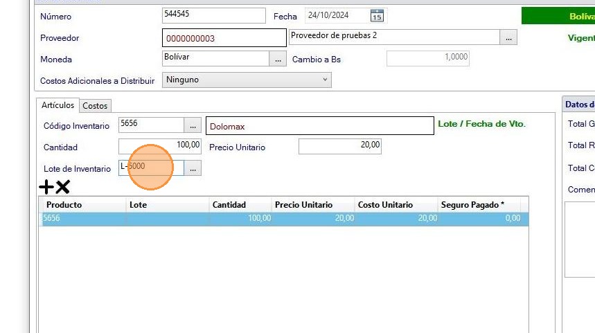 7. Paso 7. Haz clic en (+) para agregar el artículo de tipo "lote fecha de vencimiento".