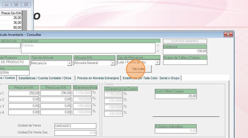 21. Paso 21. En la ventana del producto haz clic en "Ver Lotes"