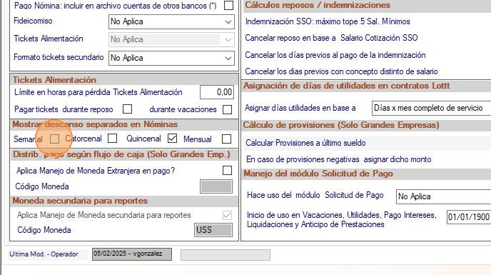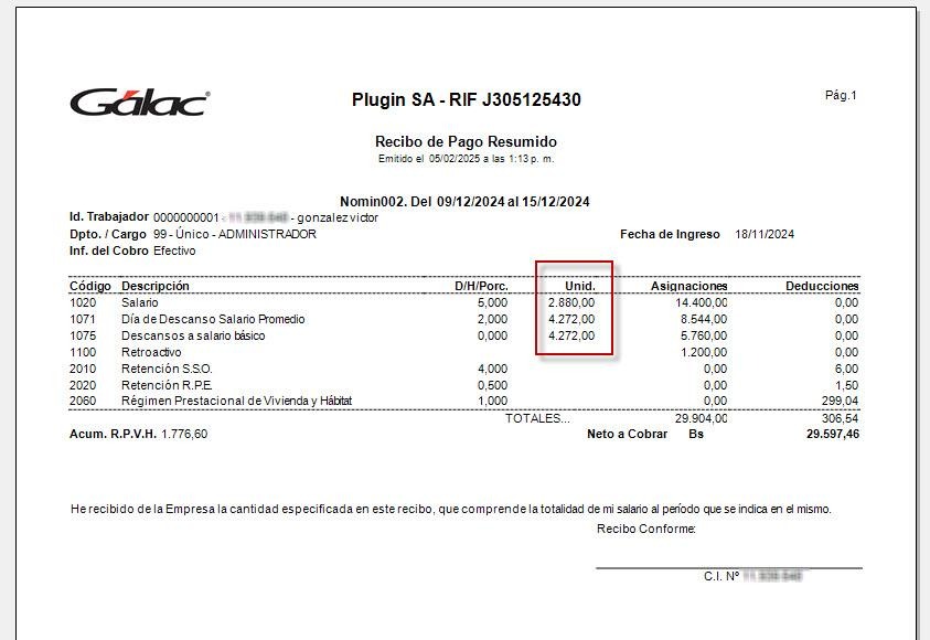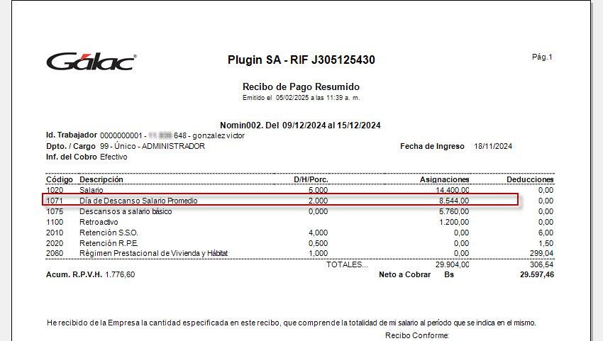 19. Si el recibo de pago sólo muestra en el valor 1 día, pero en el monto paga los 2 días de descanso, puede ocurrir que se haya colocado una codificación tanto en la entrada de descanso legal como en la de descanso convencional. Esto sólo debe hacerse si el día de descanso convencional se cancela con un concepto y el descanso legal con otro y además se han adecuado las fórmulas de ambos conceptos.