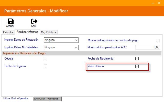 Tip: El sistema puede mostrar el valor unitario tanto en los Recibos de Pago como en la relación de pago, tildando la opción correspondiente en Parámetros Generales y de Compañía