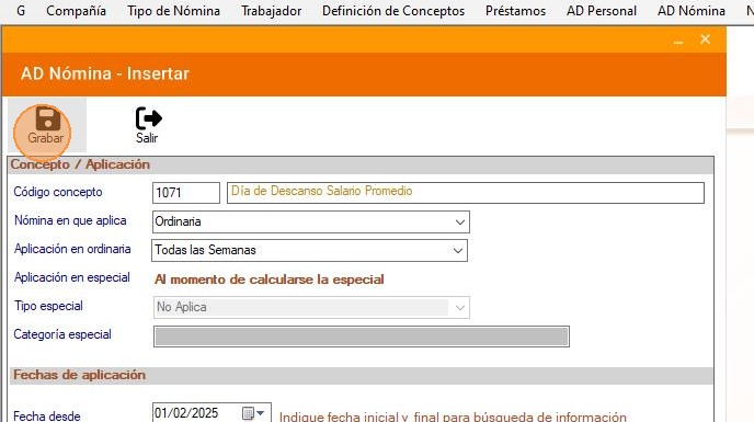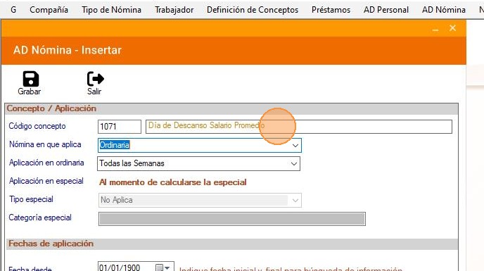 17. En el campo para el "Descanso legal", ingresa el código 1070 o 1071. Este concepto debe ser el mismo que fue ingresado en AD Nómina.